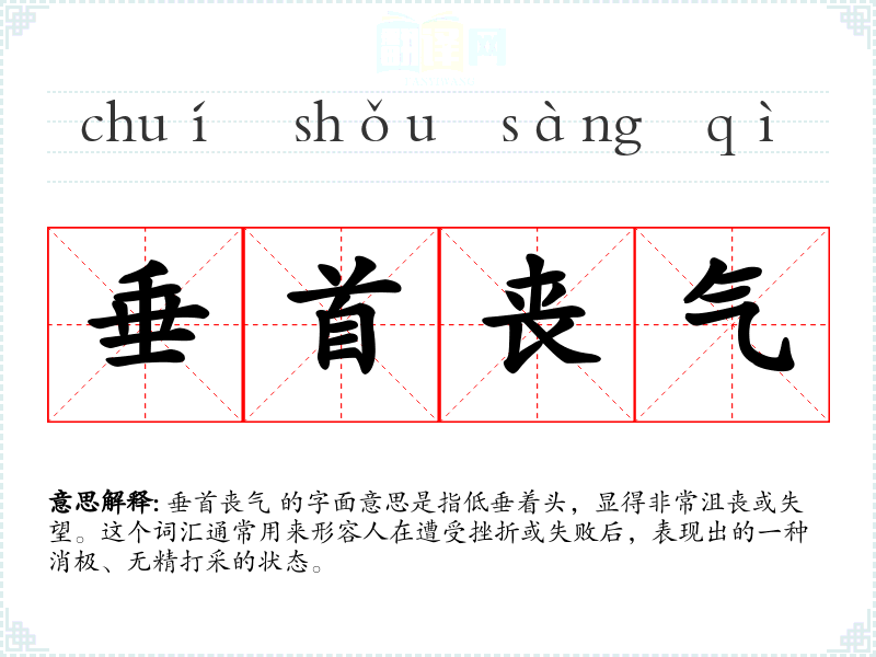 垂首丧气 的字面意思是指低垂着头,显得非常沮丧或失望。这个词汇通常用来形容人在遭受挫折或失败后,表现出的一种消极、无精打采的状态。