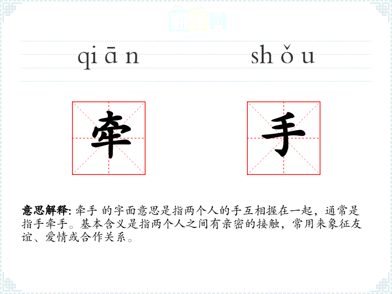 牵手 的字面意思是指两个人的手互相握在一起,通常是指手牵手。基本含义是指两个人之间有亲密的接触,常用来象征友谊、爱情或合作关系。