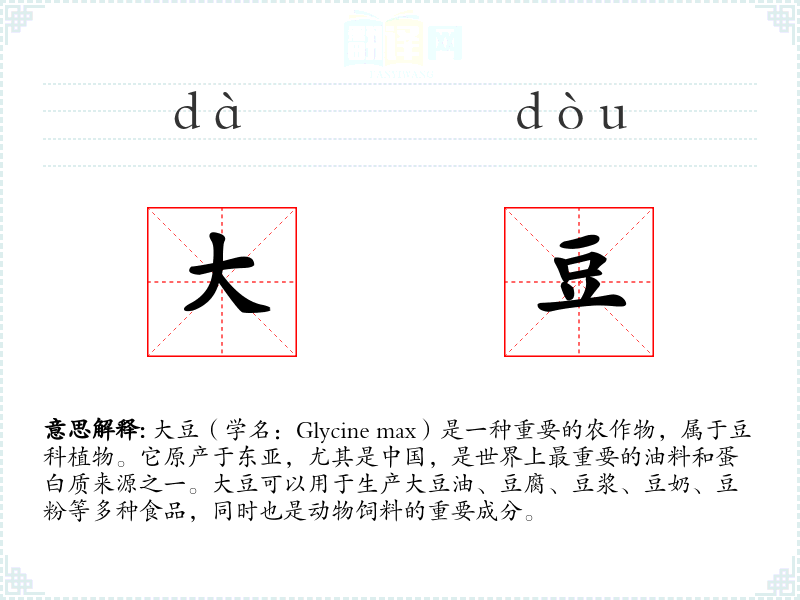"大豆"的意思解释、大豆是什么意思由翻译网汉语词典查词提供。