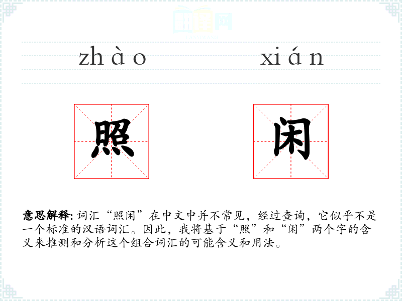 词汇“照闲”在中文中并不常见,经过查询,它似乎不是一个标准的汉语词汇。因此,我将基于“照”和“闲”两个字的含义来推测和分析这个组合词汇的可能含义和用法。