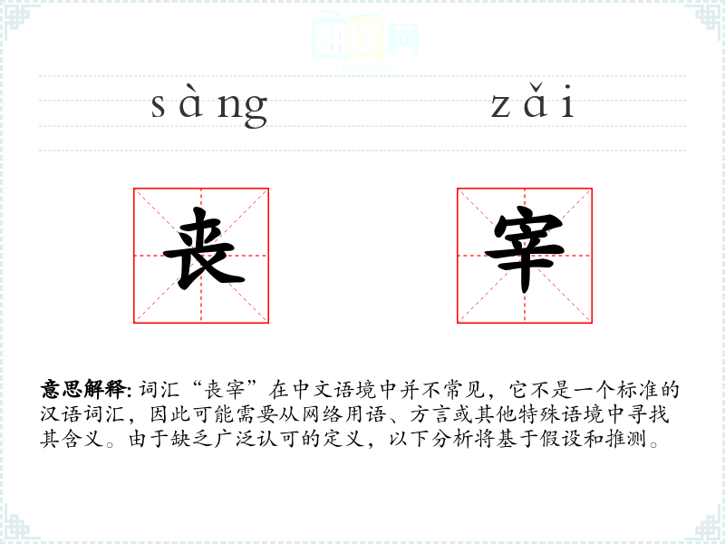 由于“丧宰”不是一个标准词汇,我们无法提供一个确切的字面意思和基本含义。它可能是某个地区方言中的词汇,或者是网络用语中的一个新造词。