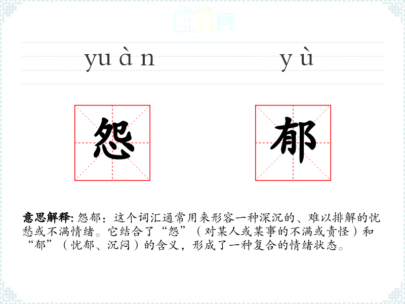 怨郁:这个词汇通常用来形容一种深沉的、难以排解的忧愁或不满情绪。它结合了“怨”(对某人或某事的不满或责怪)和“郁”(忧郁、沉闷)的含义,形成了一种复合的情绪状态。