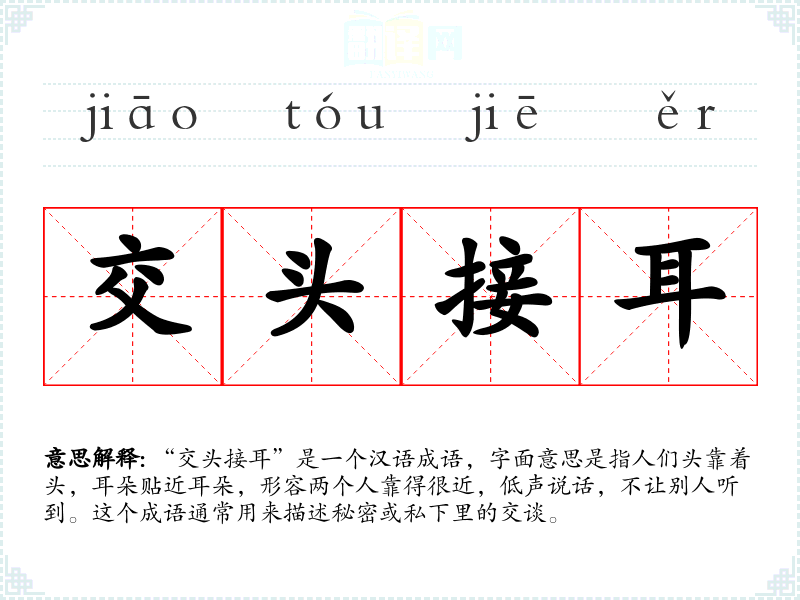 “交头接耳”是一个汉语成语,字面意思是指人们头靠着头,耳朵贴近耳朵,形容两个人靠得很近,低声说话,不让别人听到。这个成语通常用来描述秘密或私下里的交谈。