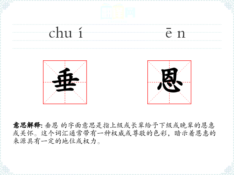 垂恩 的字面意思是指上级或长辈给予下级或晚辈的恩惠或关怀。这个词汇通常带有一种权威或尊敬的色彩,暗示着恩惠的来源具有一定的地位或权力。