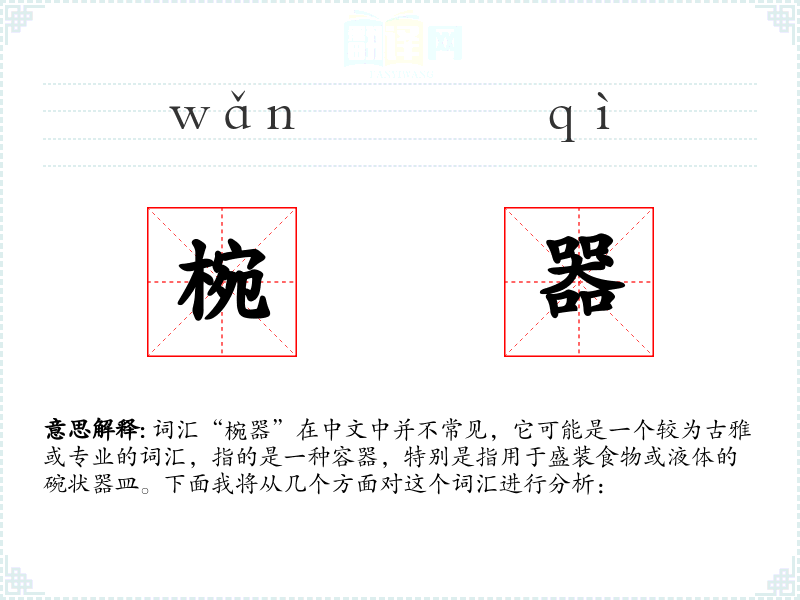 词汇“椀器”在中文中并不常见,它可能是一个较为古雅或专业的词汇,指的是一种容器,特别是指用于盛装食物或液体的碗状器皿。下面我将从几个方面对这个词汇进行分析: