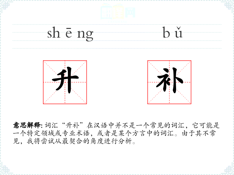 词汇“升补”在汉语中并不是一个常见的词汇,它可能是一个特定领域或专业术语,或者是某个方言中的词汇。由于其不常见,我将尝试从最契合的角度进行分析。