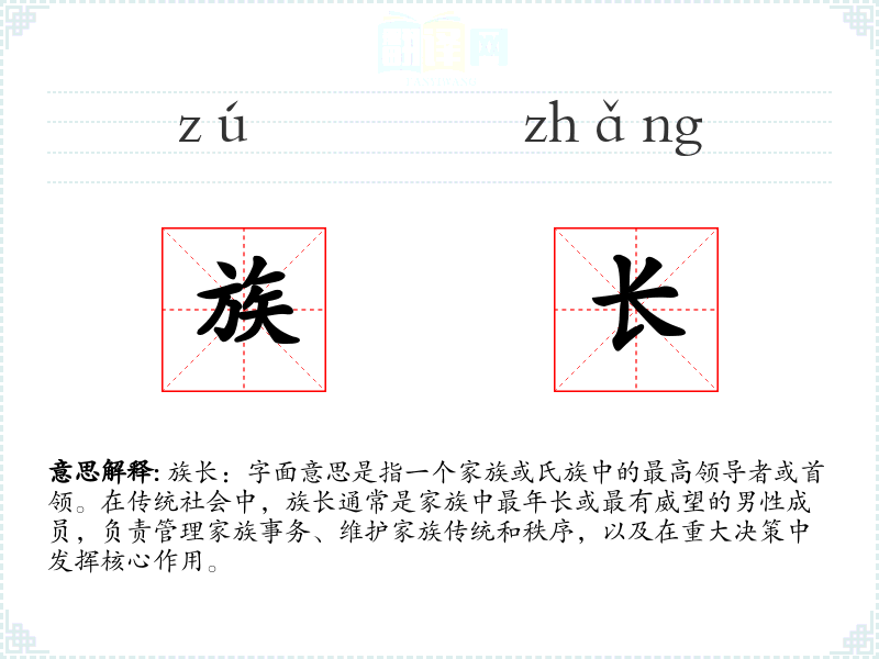 族长:字面意思是指一个家族或氏族中的最高领导者或首领。在传统社会中,族长通常是家族中最年长或最有威望的男性成员,负责管理家族事务、维护家族传统和秩序,以及在重大决策中发挥核心作用。