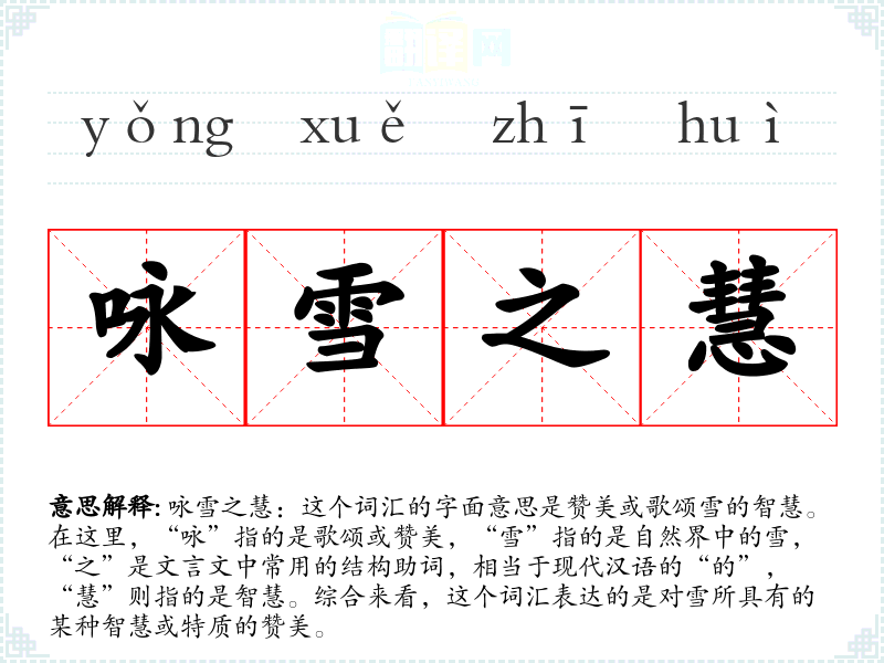 咏雪之慧:这个词汇的字面意思是赞美或歌颂雪的智慧。在这里,“咏”指的是歌颂或赞美,“雪”指的是自然界中的雪,“之”是文言文中常用的结构助词,相当于现代汉语的“的”,“慧”则指的是智慧。综合来看,这个词汇表达的是对雪所具有的某种智慧或特质的赞美。
