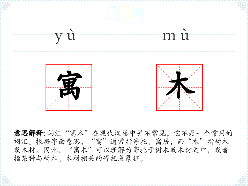 词汇“寓木”在现代汉语中并不常见,它不是一个常用的词汇。根据字面意思,“寓”通常指寄托、寓居,而“木”指树木或木材。因此,“寓木”可以理解为寄托于树木或木材之中,或者指某种与树木、木材相关的寄托或象征。