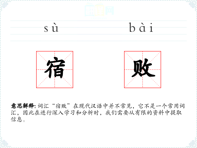词汇“宿败”在现代汉语中并不常见,它不是一个常用词汇,因此在进行深入学*和分析时,我们需要从有限的资料中提取信息。