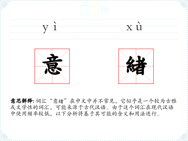 词汇“意緒”在中文中并不常见,它似乎是一个较为古雅或文学性的词汇,可能来源于古代汉语。由于这个词汇在现代汉语中使用频率较低,以下分析将基于其可能的含义和用法进行。