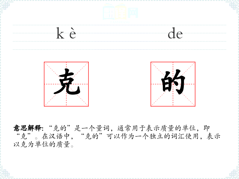 “克的”是一个量词,通常用于表示质量的单位,即“克”。在汉语中,“克的”可以作为一个独立的词汇使用,表示以克为单位的质量。