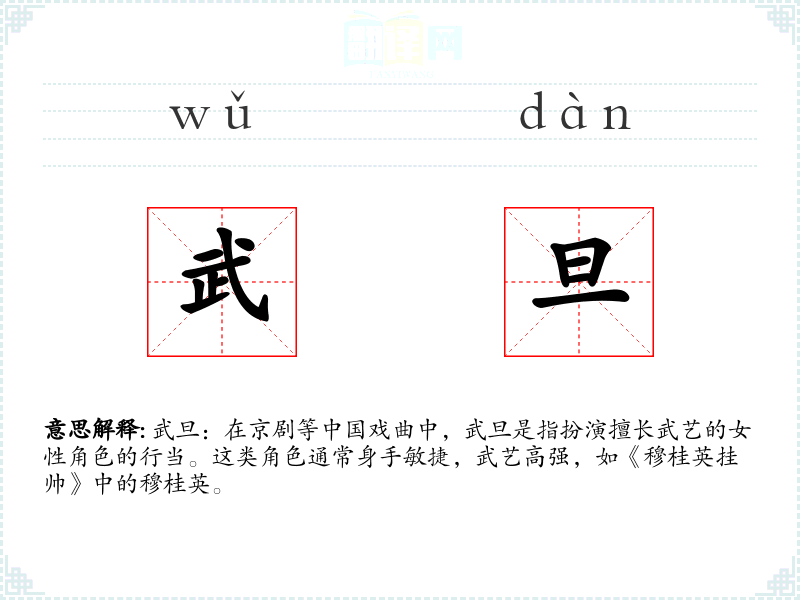 文学:在古典文学作品中,武旦的形象常被描绘为英勇善战、智勇双全的女性英雄。 口语:在日常对话中,人们可能用“武旦”来形容一个女性非常能干、有决断力。 专业领域:在戏曲研究或表演艺术中,武旦是一个专业术语,用于指代特定的戏曲角色类型。