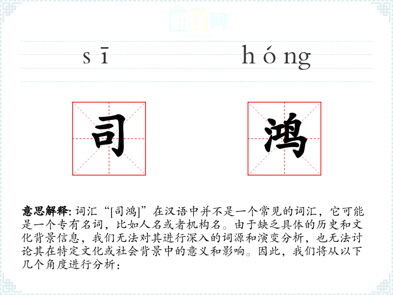 由于“[司鸿]”不是一个标准词汇,我们无法给出确切的字面意思和基本含义。它可能是一个人名,其中“司”可能是姓氏,“鸿”可能是名字,意味着“大鸟”或“宏伟”。