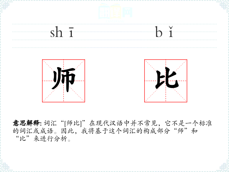 词汇“[师比]”在现代汉语中并不常见,它不是一个标准的词汇或成语。因此,我将基于这个词汇的构成部分“师”和“比”来进行分析。