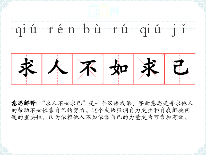 “求人不如求己”是一个汉语成语,字面意思是寻求他人的帮助不如依靠自己的努力。这个成语强调自力更生和自我解决问题的重要性,认为依赖他人不如依靠自己的力量更为可靠和有效。