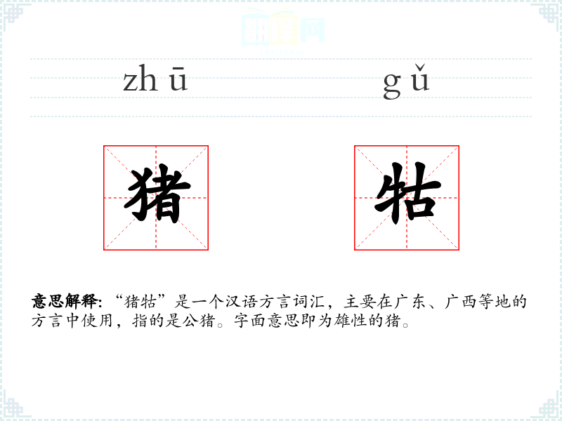 “猪牯”是一个汉语方言词汇,主要在广东、广西等地的方言中使用,指的是公猪。字面意思即为雄性的猪。