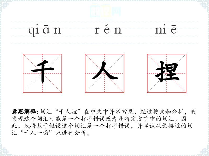 词汇“千人捏”在中文中并不常见,经过搜索和分析,我发现这个词汇可能是一个打字错误或者是特定方言中的词汇。因此,我将基于假设这个词汇是一个打字错误,并尝试从最接近的词汇“千人一面”来进行分析。