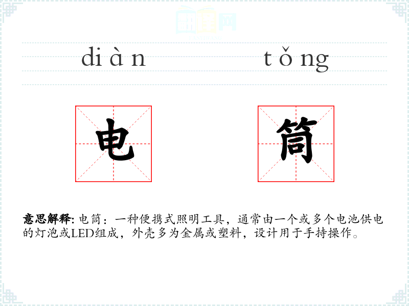 - 反义词:无(电筒作为特定工具,没有直接的反义词)