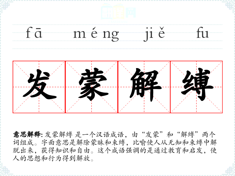 发蒙解缚 是一个汉语成语,由“发蒙”和“解缚”两个词组成。字面意思是解除蒙昧和束缚,比喻使人从无知和束缚中解脱出来,获得知识和自由。这个成语强调的是通过教育和启发,使人的思想和行为得到解放。