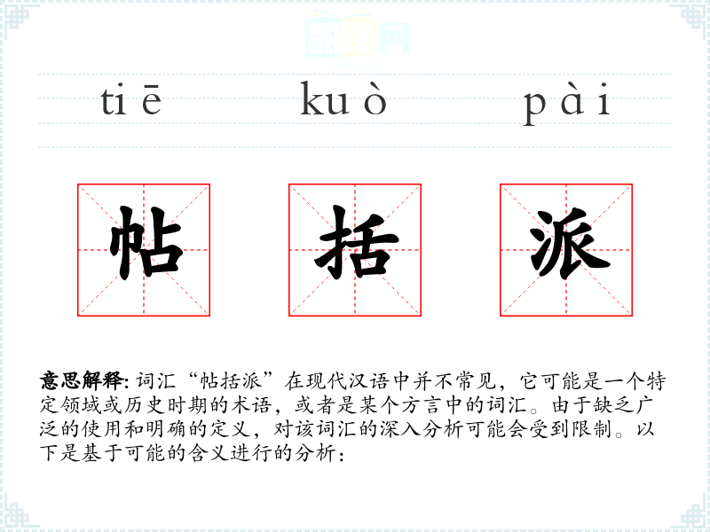 词汇“帖括派”在现代汉语中并不常见,它可能是一个特定领域或历史时期的术语,或者是某个方言中的词汇。由于缺乏广泛的使用和明确的定义,对该词汇的深入分析可能会受到限制。以下是基于可能的含义进行的分析: