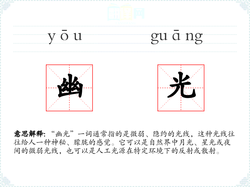 “幽光”一词的词源较为直接,由“幽”和“光”两个字组成。“幽”字在中文中常指深邃、隐秘,而“光”则指光线。随着时间的推移,这个词在文学和日常语言中被广泛使用,用以描述各种微弱而神秘的光线。