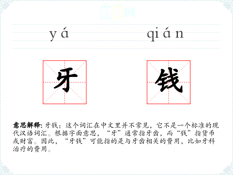 牙钱:这个词汇在中文里并不常见,它不是一个标准的现代汉语词汇。根据字面意思,“牙”通常指牙齿,而“钱”指货币或财富。因此,“牙钱”可能指的是与牙齿相关的费用,比如牙科治疗的费用。