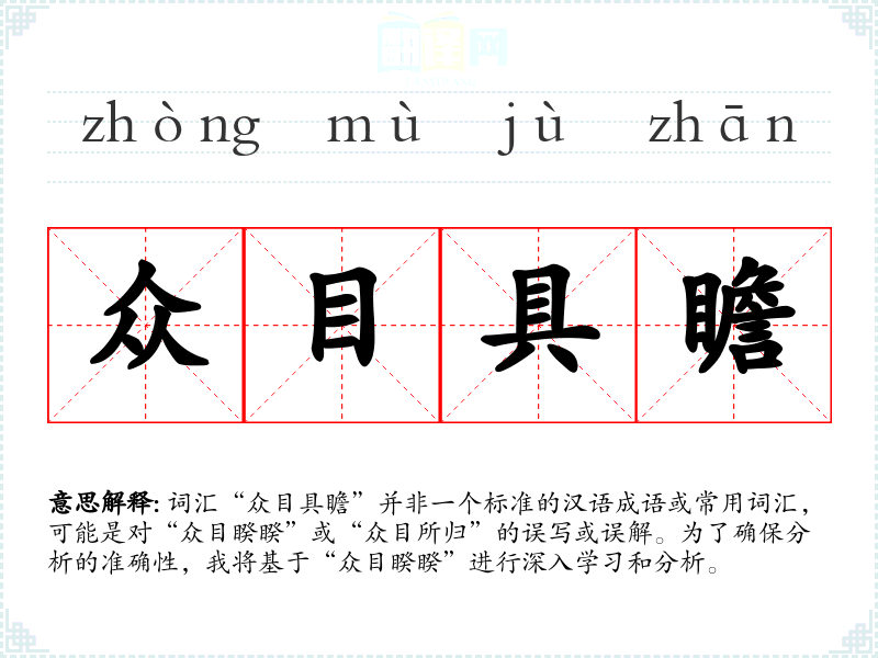 词汇“众目具瞻”并非一个标准的汉语成语或常用词汇,可能是对“众目睽睽”或“众目所归”的误写或误解。为了确保分析的准确性,我将基于“众目睽睽”进行深入学*和分析。