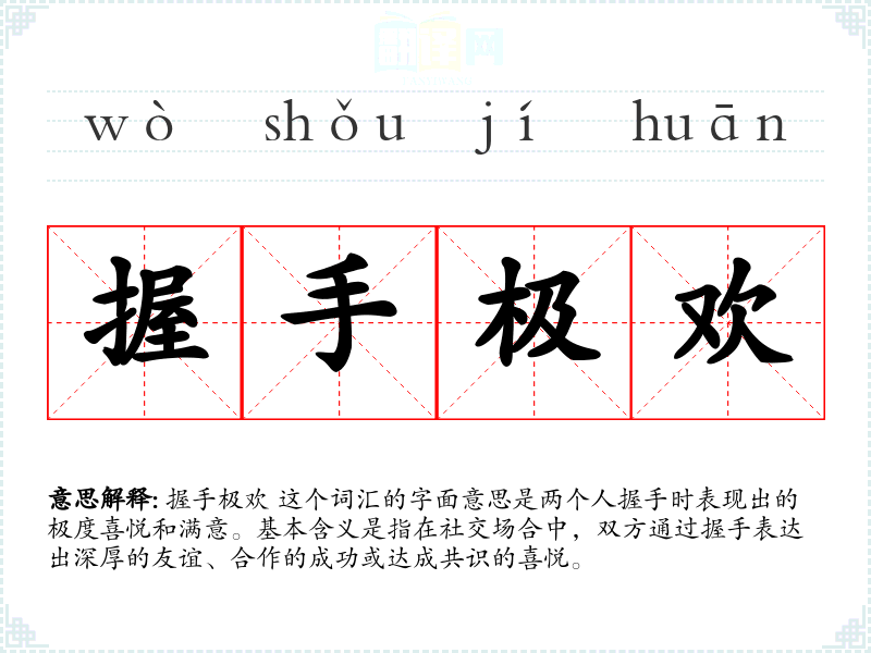 握手极欢 这个词汇的字面意思是两个人握手时表现出的极度喜悦和满意。基本含义是指在社交场合中,双方通过握手表达出深厚的友谊、合作的成功或达成共识的喜悦。