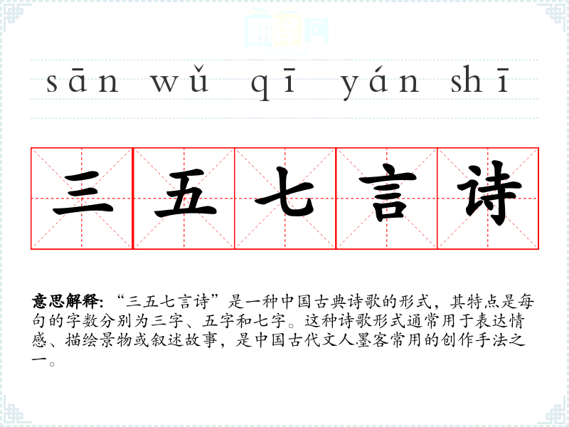 “三五七言诗”是一种古典诗歌的形式,其特点是每句的字数分别为三字、五字和七字。这种诗歌形式通常用于表达情感、描绘景物或叙述故事,是古代文人墨客常用的创作手法之一。