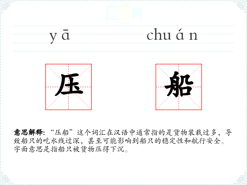 “压船”这个词汇在汉语中通常指的是货物装载过多,导致船只的吃水线过深,甚至可能影响到船只的稳定性和航行安全。字面意思是指船只被货物压得下沉。