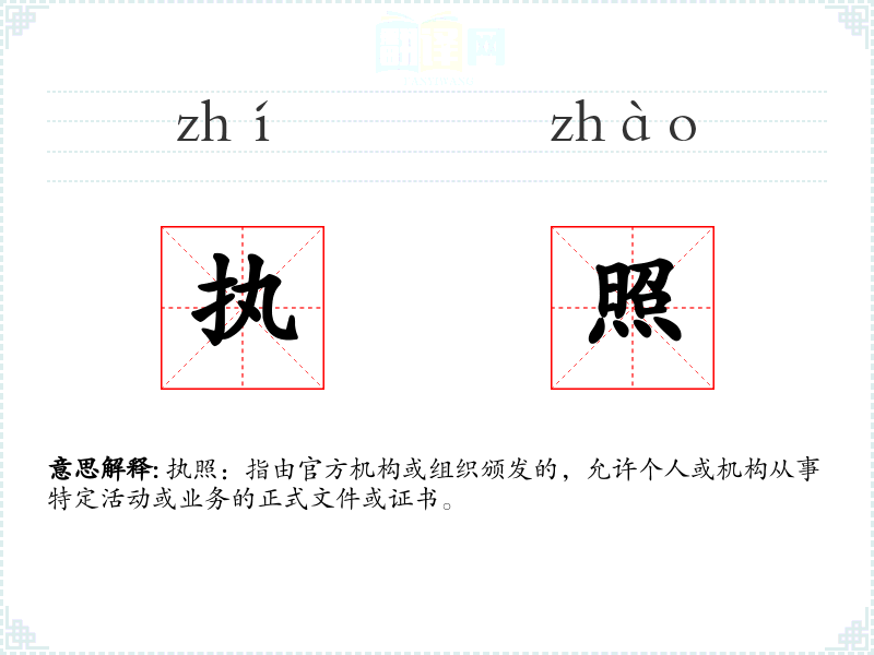 - 演变:随着社会的发展,执照的含义逐渐具体化,特指官方颁发的允许从事特定活动的文件。