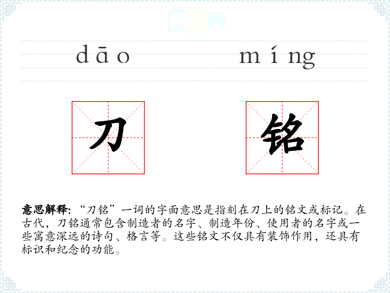 同义词:刀刻、刀文、刀记 反义词:无(由于“刀铭”是一个特定领域的词汇,通常没有直接的反义词)