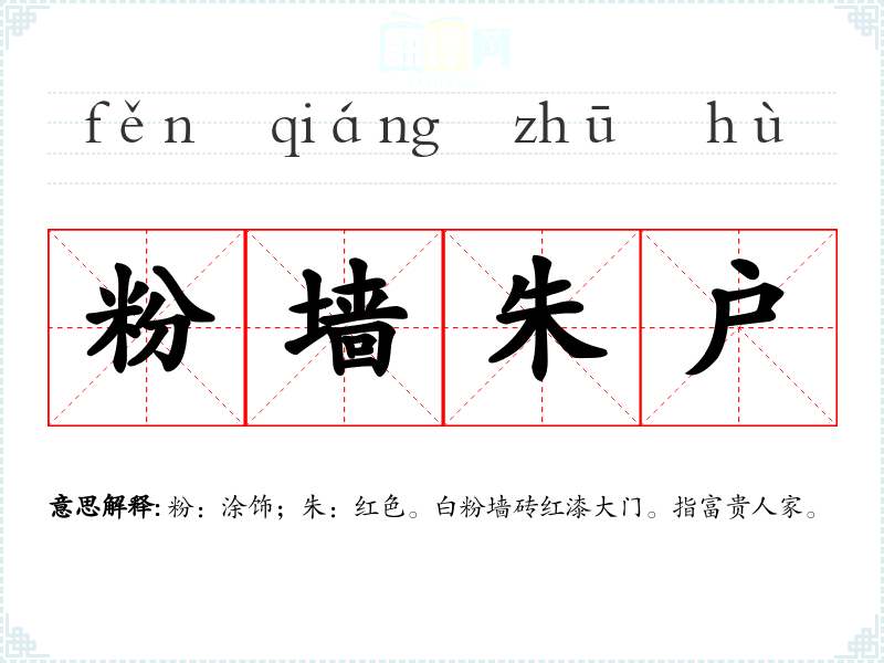 粉:涂饰;朱:红色。白粉墙砖红漆大门。指富贵人家。