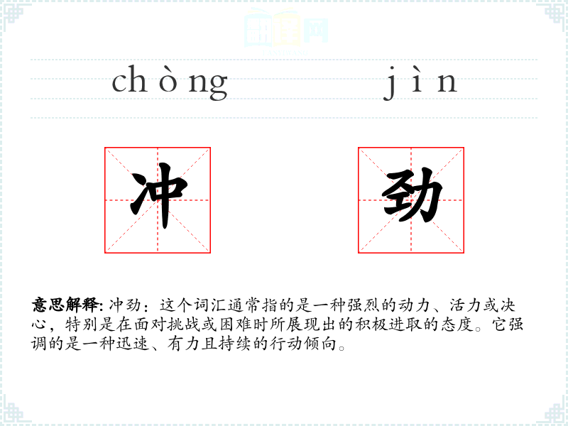 冲劲:这个词汇通常指的是一种强烈的动力、活力或决心,特别是在面对挑战或困难时所展现出的积极进取的态度。它强调的是一种迅速、有力且持续的行动倾向。