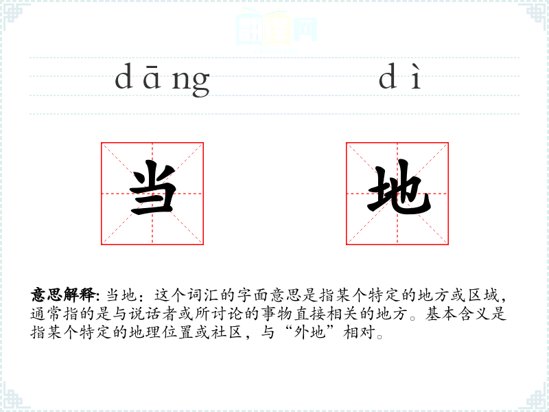 当地:这个词汇的字面意思是指某个特定的地方或区域,通常指的是与说话者或所讨论的事物直接相关的地方。基本含义是指某个特定的地理位置或社区,与“外地”相对。