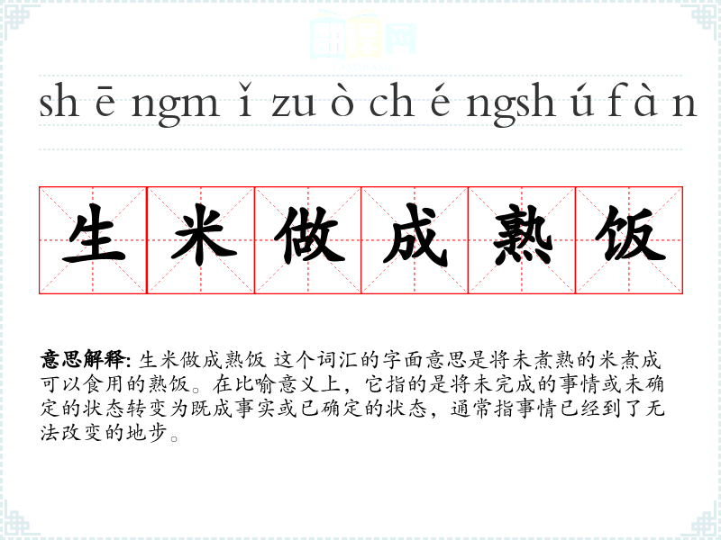 生米做成熟饭 这个词汇的字面意思是将未煮熟的米煮成可以食用的熟饭。在比喻意义上,它指的是将未完成的事情或未确定的状态转变为既成事实或已确定的状态,通常指事情已经到了无法改变的地步。