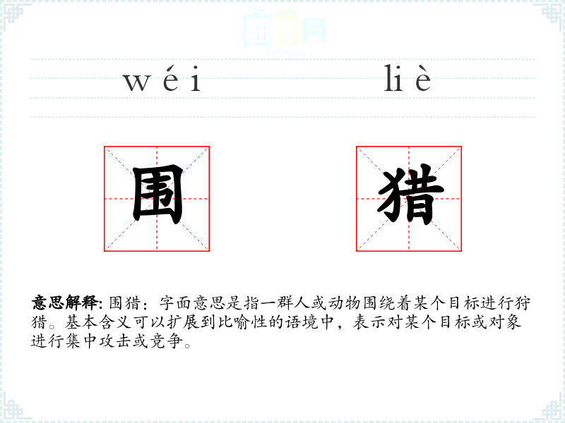 围猎:字面意思是指一群人或动物围绕着某个目标进行狩猎。基本含义可以扩展到比喻性的语境中,表示对某个目标或对象进行集中攻击或竞争。