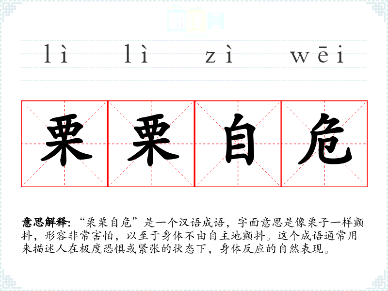 “栗栗自危”是一个汉语成语,字面意思是像栗子一样颤抖,形容非常害怕,以至于身体不由自主地颤抖。这个成语通常用来描述人在极度恐惧或紧张的状态下,身体反应的自然表现。