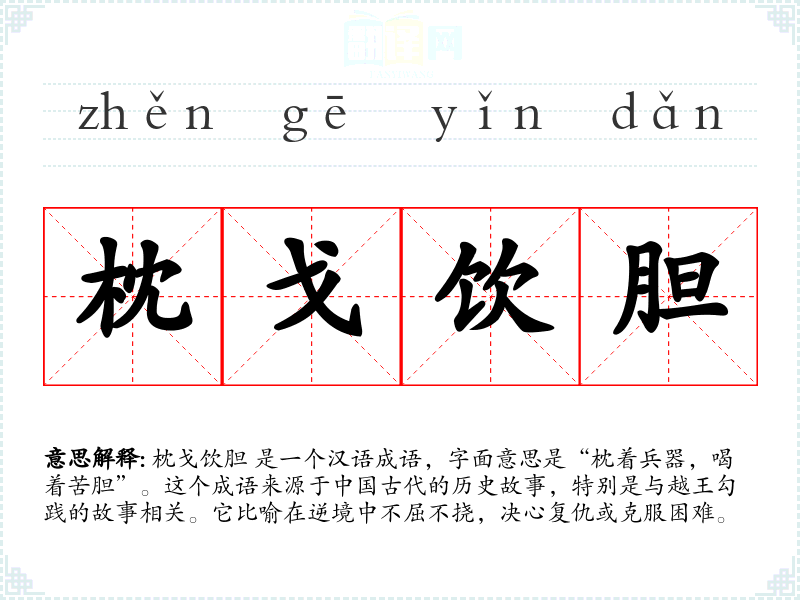枕戈饮胆 是一个汉语成语,字面意思是“枕着兵器,喝着苦胆”。这个成语来源于**古代的历史故事,特别是与越王勾践的故事相关。它比喻在逆境中不屈不挠,决心复仇或克服困难。