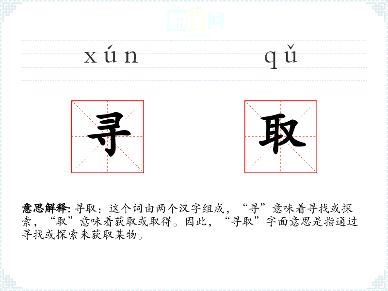 寻取:这个词由两个汉字组成,“寻”意味着寻找或探索,“取”意味着获取或取得。因此,“寻取”字面意思是指通过寻找或探索来获取某物。
