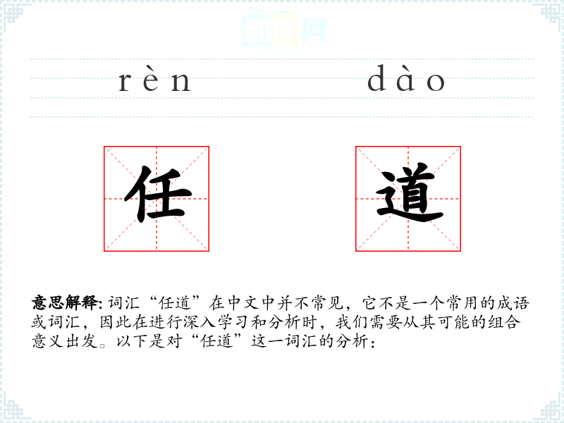 词汇“任道”在中文中并不常见,它不是一个常用的成语或词汇,因此在进行深入学*和分析时,我们需要从其可能的组合意义出发。以下是对“任道”这一词汇的分析: