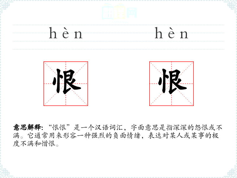 “恨恨”是一个汉语词汇,字面意思是指深深的怨恨或不满。它通常用来形容一种强烈的负面情绪,表达对某人或某事的极度不满和憎恨。