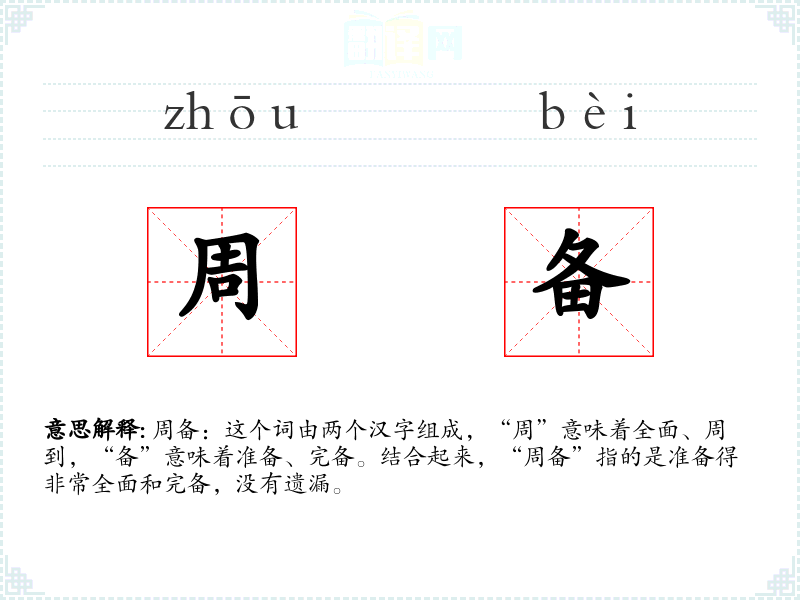周备:这个词由两个汉字组成,“周”意味着全面、周到,“备”意味着准备、完备。结合起来,“周备”指的是准备得非常全面和完备,没有遗漏。