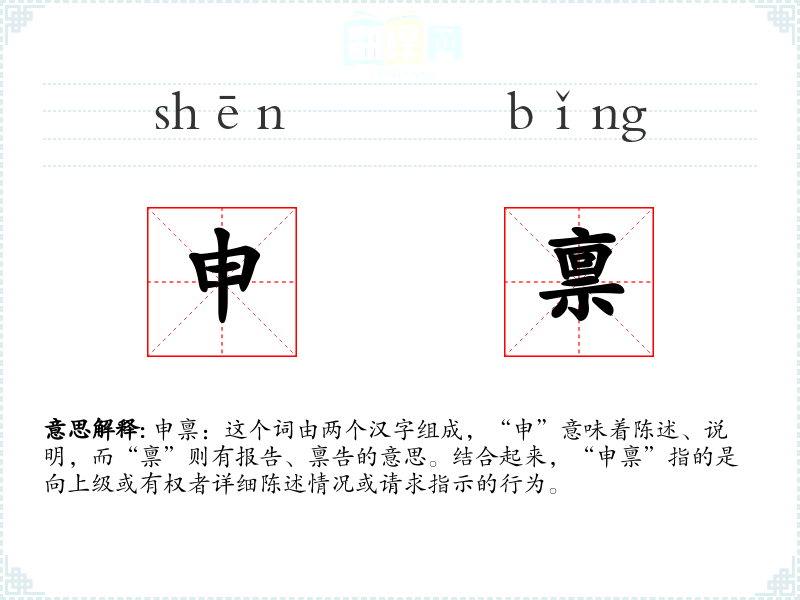申禀:这个词由两个汉字组成,“申”意味着陈述、说明,而“禀”则有报告、禀告的意思。结合起来,“申禀”指的是向上级或有权者详细陈述情况或请求指示的行为。