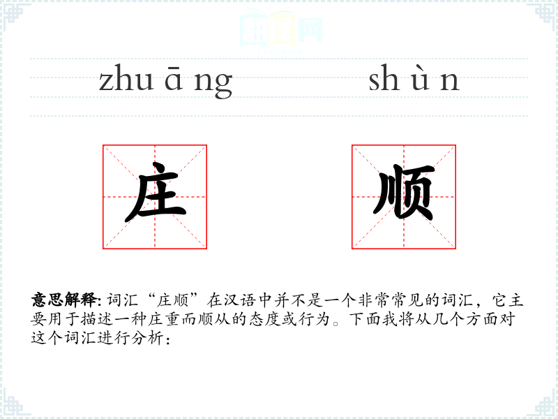 词汇“庄顺”在汉语中并不是一个非常常见的词汇,它主要用于描述一种庄重而顺从的态度或行为。下面我将从几个方面对这个词汇进行分析: