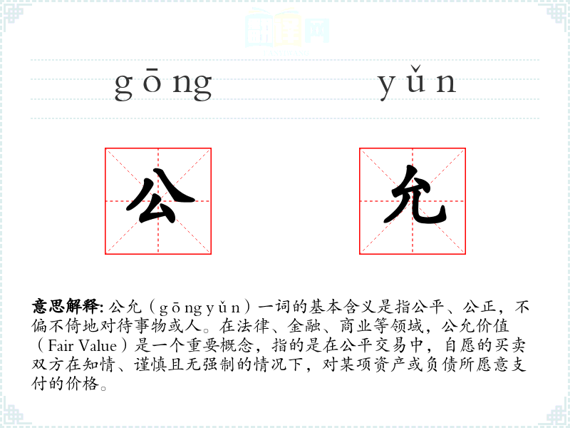 公允(gōng yǔn)一词的基本含义是指公平、公正,不偏不倚地对待事物或人。在法律、金融、商业等领域,公允价值(Fair Value)是一个重要概念,指的是在公平交易中,自愿的买卖双方在知情、谨慎且无强制的情况下,对某项资产或负债所愿意支付的价格。