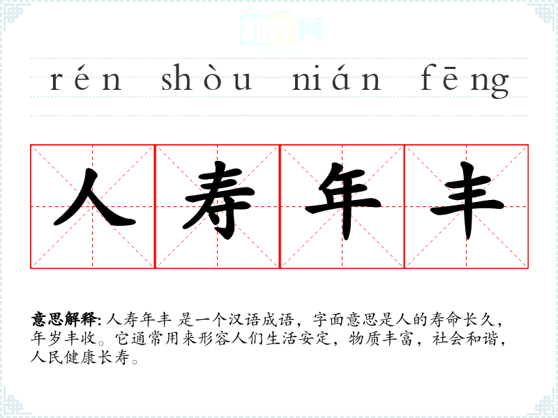 人寿年丰 是一个汉语成语,字面意思是人的寿命长久,年岁丰收。它通常用来形容人们生活安定,物质丰富,社会和谐,人民健康长寿。