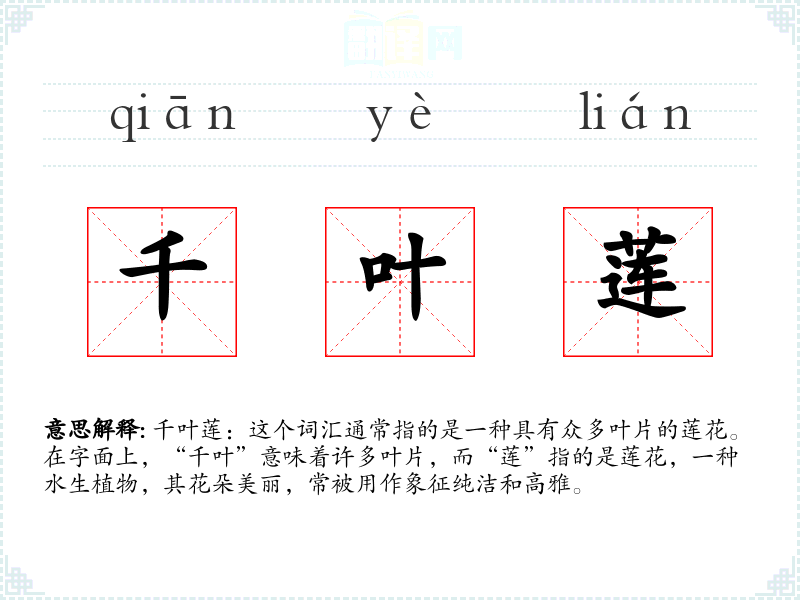 - 口语:在日常对话中,千叶莲可能不常见,但如果提到,通常是为了描述某种特别美丽的莲花。