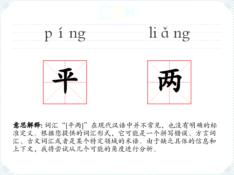 词汇“[平两]”在现代汉语中并不常见,也没有明确的标准定义。根据您提供的词汇形式,它可能是一个拼写错误、方言词汇、古文词汇或者是某个特定领域的术语。由于缺乏具体的信息和上下文,我将尝试从几个可能的角度进行分析。